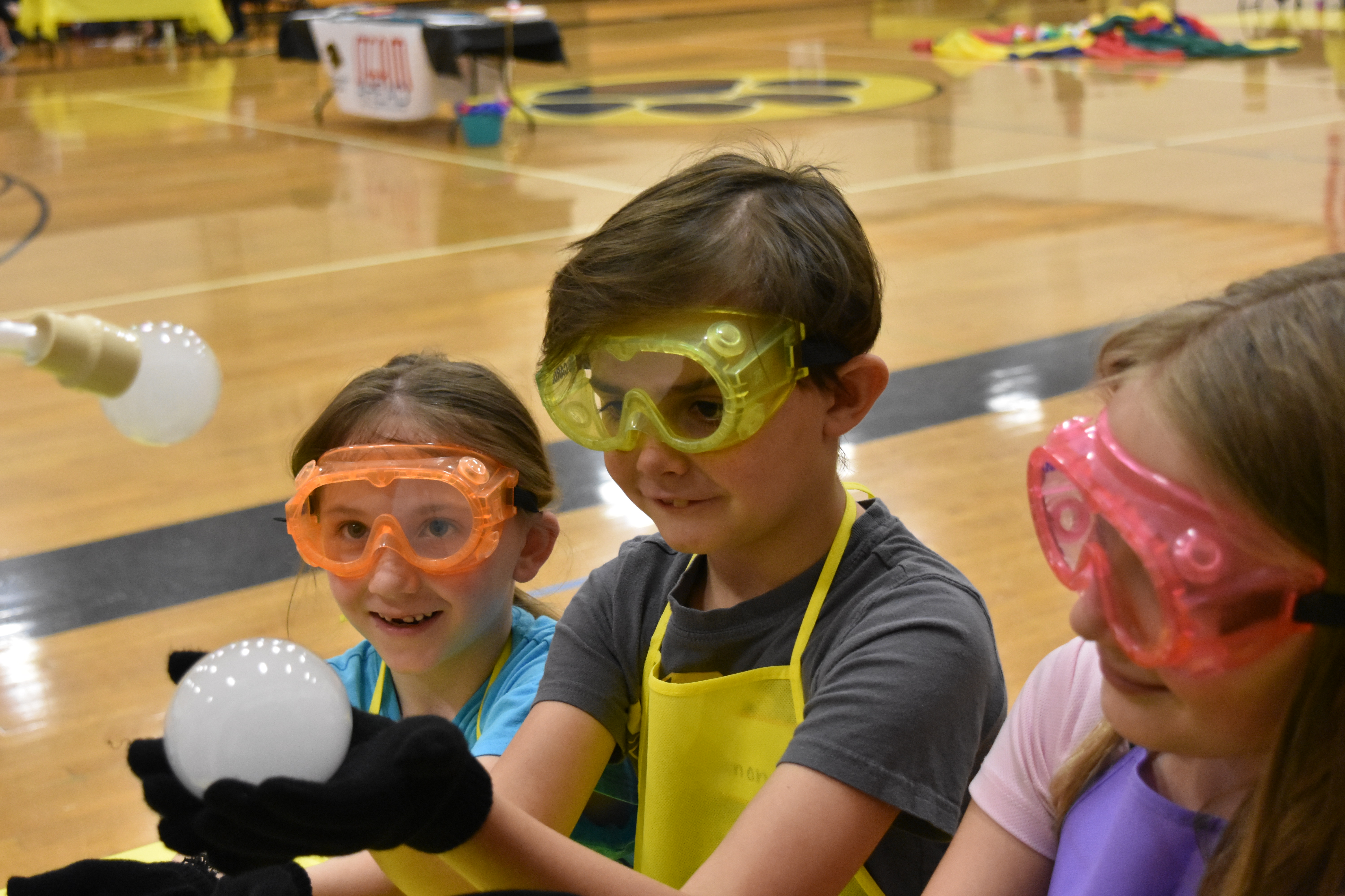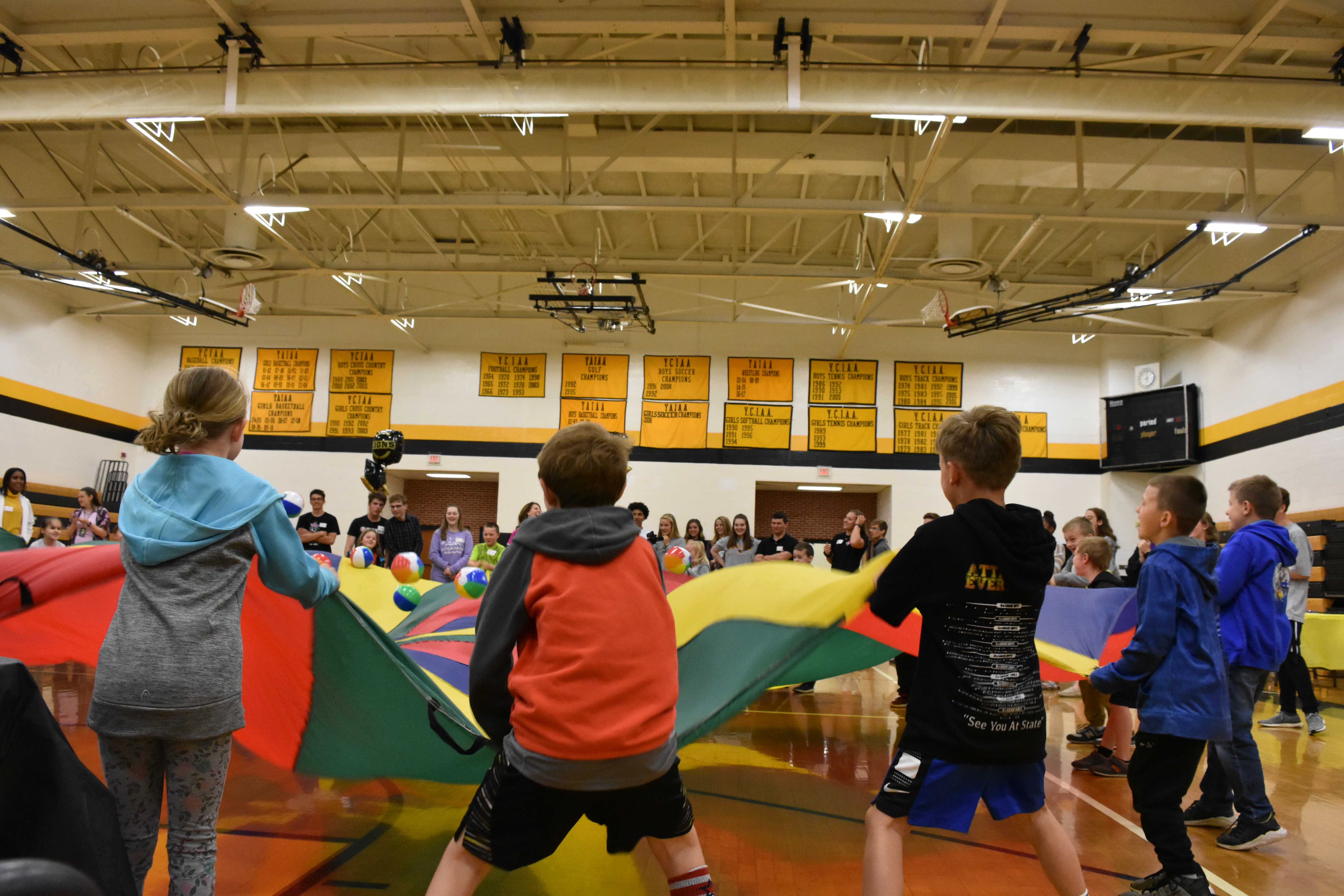 After testing out aerodynamics by bouncing balls on top a giant red, yellow and blue parachute, the students rotated between activity stations run by about two dozen high school students.