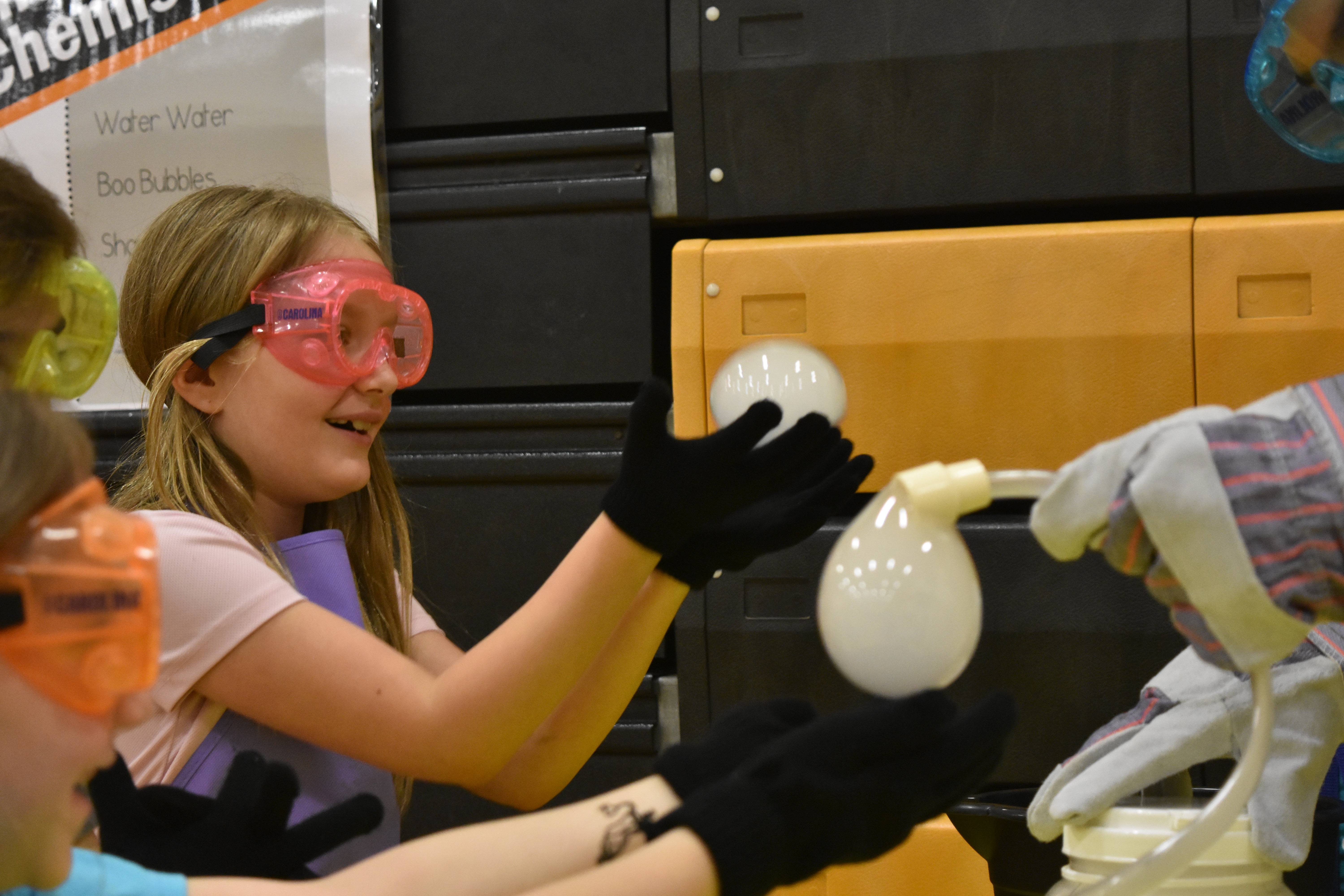 Second graders watched sophomore Isaiah Morales make bubbles created with the carbon dioxide from dry ice in water. The students then created their own masterpiece with the shaving cream lab that students in the high school chemistry class do for one of their labs.