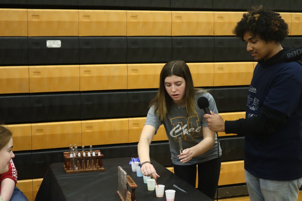 Senior Devin Irizarry interviews sophomore Chloe Austin as she builds a rainbow using chemistry knowledge. The STEAM ahead event required a wide range of students to make it possible. Taken by: Red Lion student media