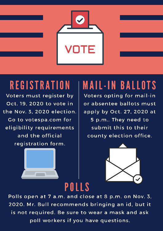According to Mr. Bull registration is vital to the voting process. He says that people will be denied to vote if they are not registered by Oct. 19, 2020. He suggests looking at https://www.votespa.com/ for detailed election information.
