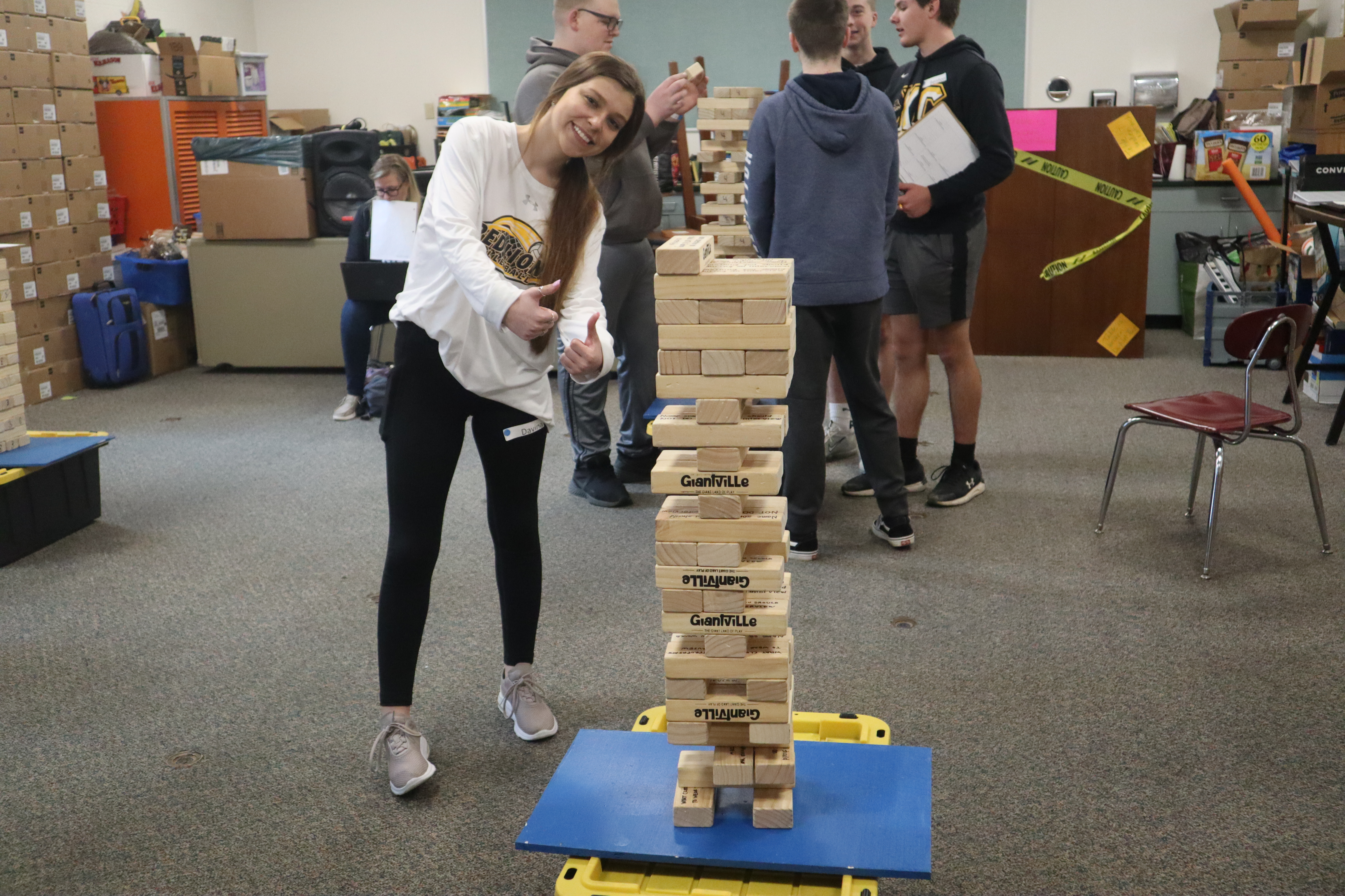 Juniors play giant Jenga to learn about interviewing. Each Jenga piece has a question about interviewing written on the side. Students received one on one instruction from volunteers during budgeting practice. Each student received an occupation and budgeted accordingly. Students flip through their budgeting books to choose a car dependent on their salaries. A parent volunteer lectures a small ground of students.Evan Mader explains the game #adulting to a group of juniors.